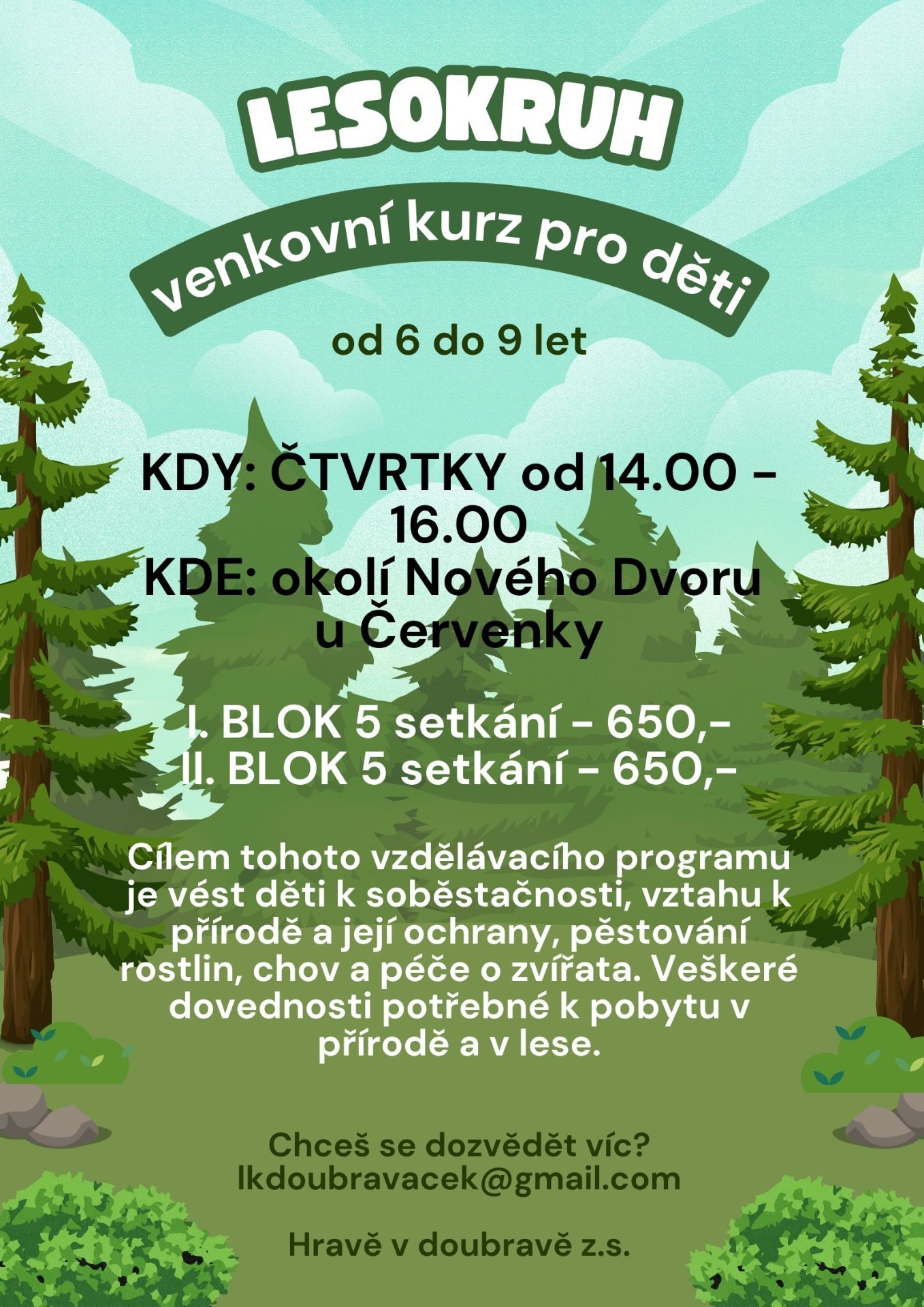 LESOKRUH je kurz pro děti mladšího školního věku od 6 do 9 let, který je zaměřen na pobyt ve venkovním prostředí.